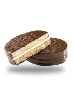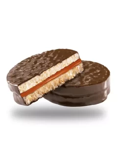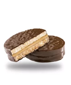 Alfajor de arroz integral cubierto con baño de repostería. Libre de gluten. Sin TACC. Aptos para celiacos.