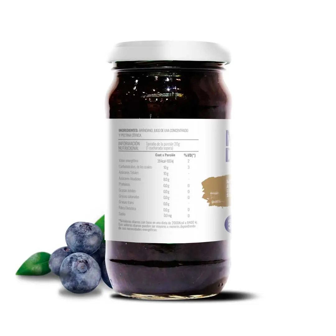 Mermelada natural sin azúcar, especial y equilibrada, elaborada con arándanos frescos. Endulzada con jugo de uva, 100% Fruta, sin conservantes ni edulcorantes artificiales. Sin TACC. Bajas en calorías Apto veganos.